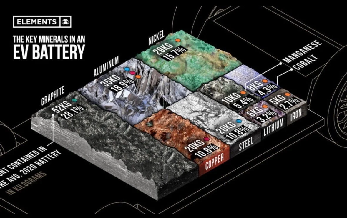 Just one typical EV, say for example a Tesla Model 3, will contain 6 kg of lithium, 8kg of cobalt, 42 kg of nickel, 8 kilos of aluminium, 17 kg of copper and 55 kilos of graphite.